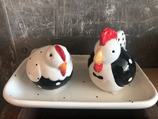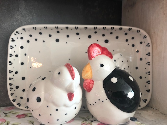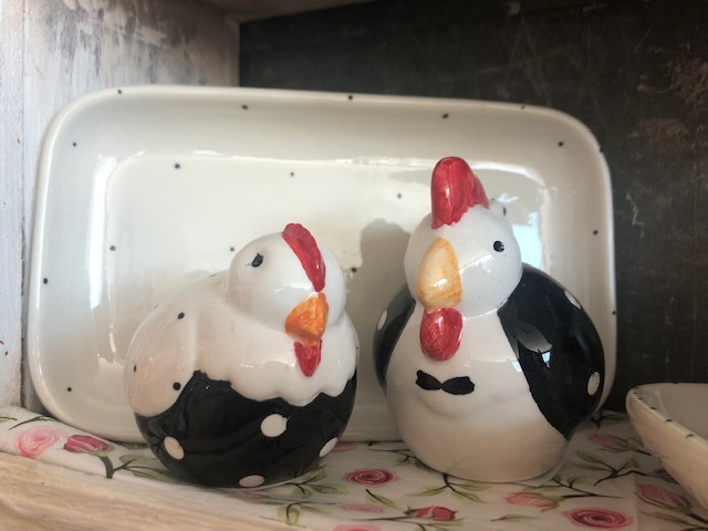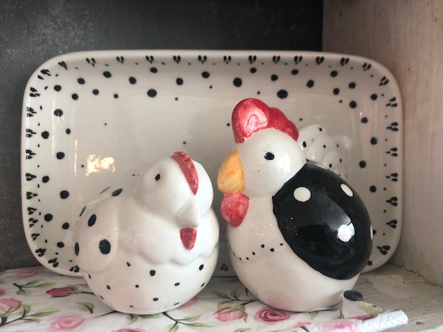 Keramična posoda v obliki kokoši in petelina s podstavkom.